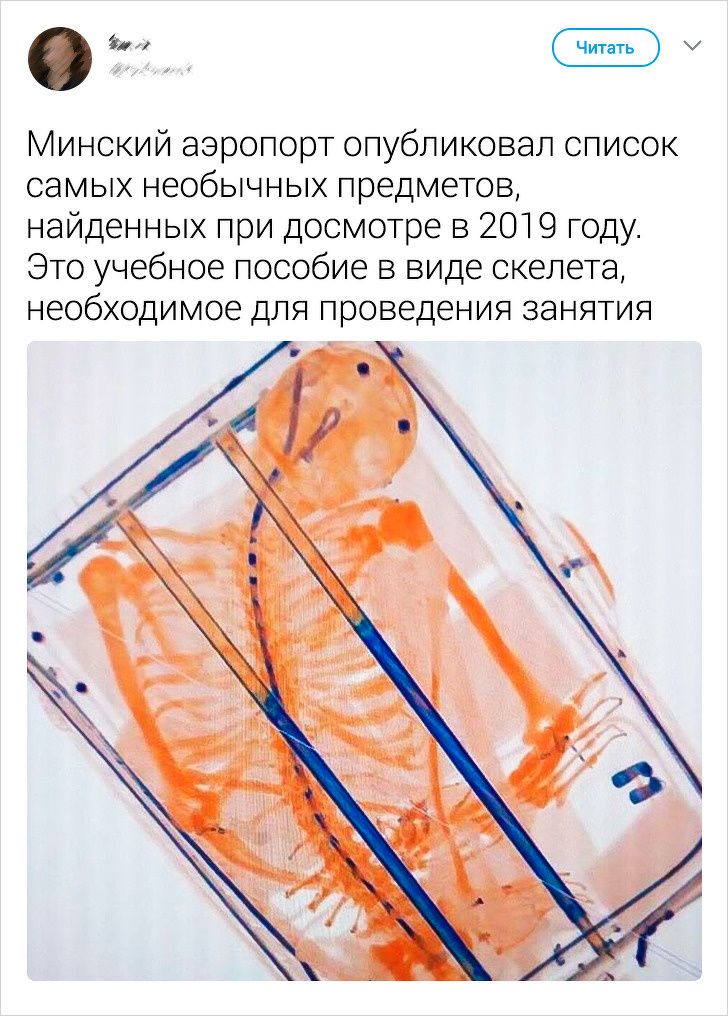 - Подружня пара летіла з Великобританії в США, щоб відсвяткувати ювілей одного з подружжя. Але їх зупинили на огляді: сек'юріті побачили у валізі тварина. Виявилося, що в багаж пари непомітно пробрався їх кіт. Подружжя запевнили співробітників аеропорту, що не збиралися брати кота в подорож і, так як він обожнює інспектувати сумки і коробки, він, мабуть, «упаковался» у валізу сам. На щастя, друзі пари встигли забрати кота додому і вона встигла на свій рейс до Нью-Йорка. © Nick Coole / Facebook