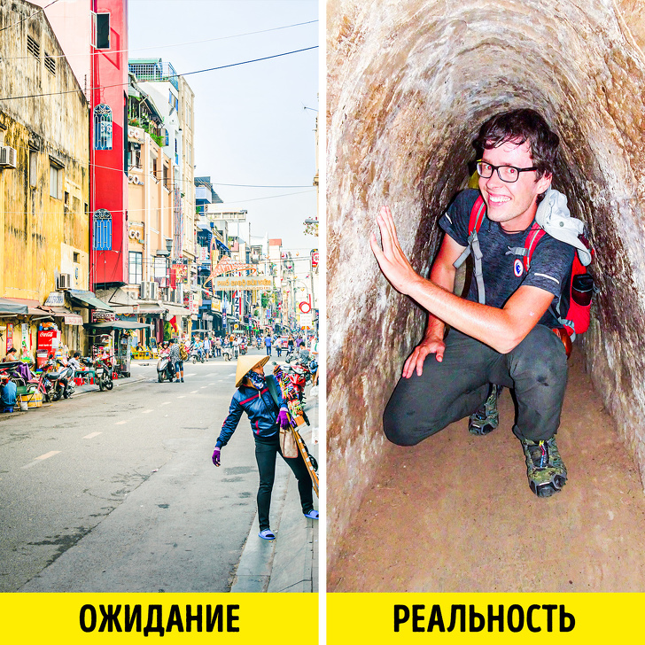 - В топі пам'яток — оглядовий майданчик Фінансової вежі Bitexco (Bitexco Financial Tower) і тунелі Ку-Чи. Останні настійно рекомендують побачити мандрівники: «Нам сказали, що їздити туди не треба, мовляв, ми даремно втратимо день і не побачимо нічого цікавого. Тому їхали без особливого ентузіазму, але в підсумку виявилася одна з найцікавіших екскурсій в моєму житті. Про В'єтнамську війну я до цього знала мало — те, що бачила у фільмах. Коли опиняєшся в цих тунелях шириною 40-50 см і висотою 60-80 см, дуже жваво уявляєш, що там відбувалося 50 років тому. Ходиш, дивишся на всі ці пастки з шипами, як у фільмах про Індіану Джонса, танки, гранати, кулемети, осколки — стає не по собі».