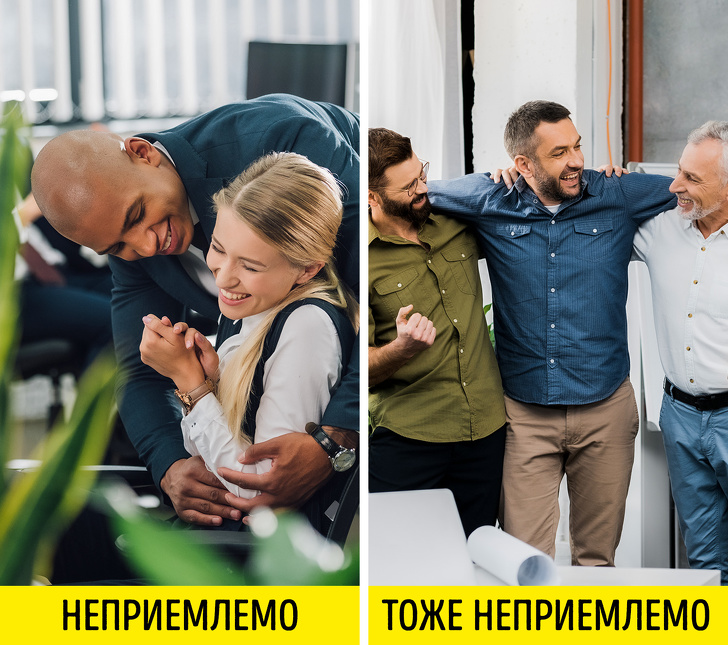 Якщо ви працюєте в офісі і хочете обійняти свого колегу, підбадьорити його, порадіти успіху, то це буде сприйнято як домагання, і неважливо, чоловік ви або жінка. А якщо вас в громадському транспорті хто-небудь випадково зачепить рюкзаком, то ви вправі звинуватити його в домаганні.