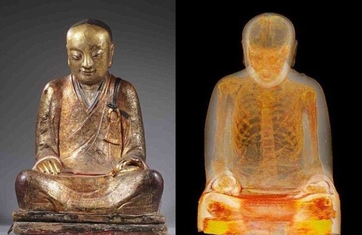 Ця знахідка, як і попередня, була зроблена вченими зовсім випадково. Всередині 1 000-річної статуї Будди реставратори, які проводили ремонт її постаменту, виявили справжню людську мумію. Виявилося, що верхня частина скульптури являла собою саркофаг з позолоченого пап'є-маше, який мав оберігати тіло мумії від зовнішніх пошкоджень, а також зберігати заховані разом з нею давні тексти.