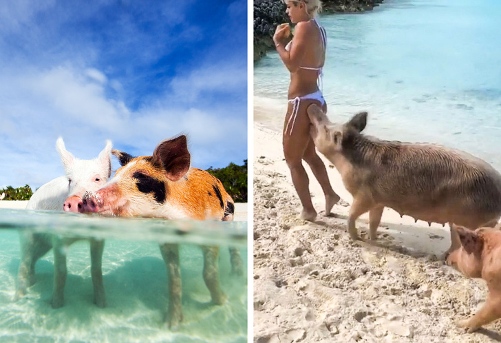 Свинячий пляж славиться чистою водою і доброзичливими мешканцями, в честь яких він названий, — свинями. Сюди приїжджають заради них. Втім, популярної блогерше Мішель Левін не пощастило: вона отримала укус такої сили, що залишився синець, і цей випадок не єдиний.
