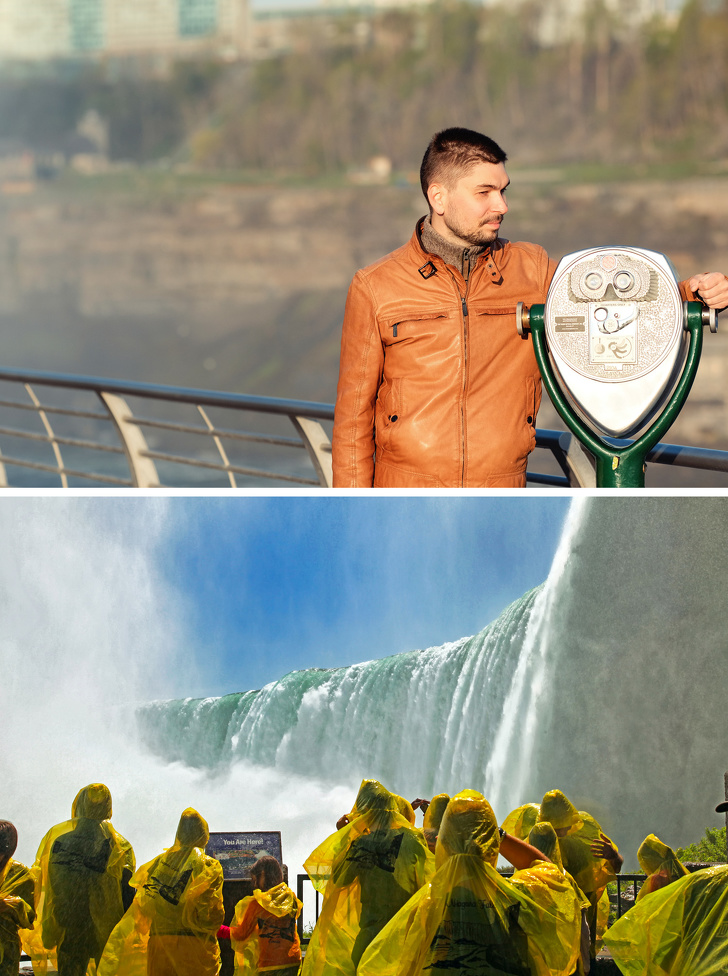 Зі знаменитим Ніагарським водоспадом все просто: чим ближче підходиш до нього, тим вологішим стає, тому туристи поголовно надягають дощовики і ховають техніку, щоб не пошкодити її. Хоча ситуація логічна, багато виявляються до неї не готові.