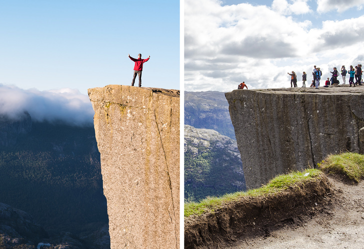 Хоча до скелі потрібно пройти 8 км, піднімаючись у гори, тисячі людей готові на це. Так що тим, хто осилив перехід, доводиться шикуватися в чергу для знімка на краю обриву.