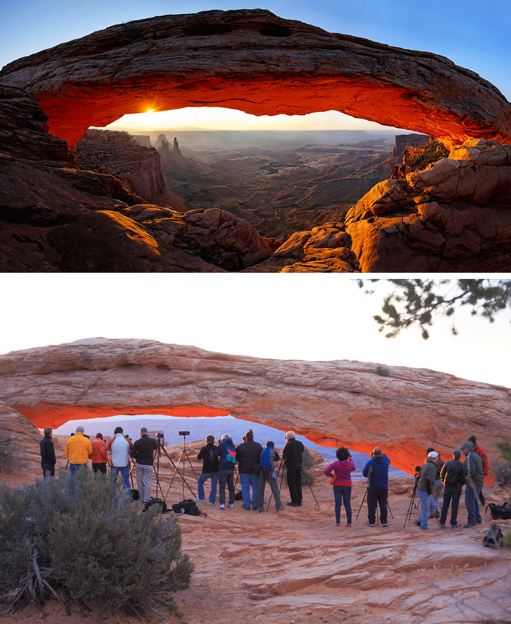Розкішний вид на каньйони відкривається звідси в будь-який момент часу. Але туристи воліють приїжджати на світанку, щоб помилуватися грою сонячних променів на внутрішній поверхні арки. Розвага настільки популярно, що бажають доводиться приїжджати за годину-дві до світанку, щоб зайняти найбільш вигідні з точки зору ракурсу місця для зйомки.