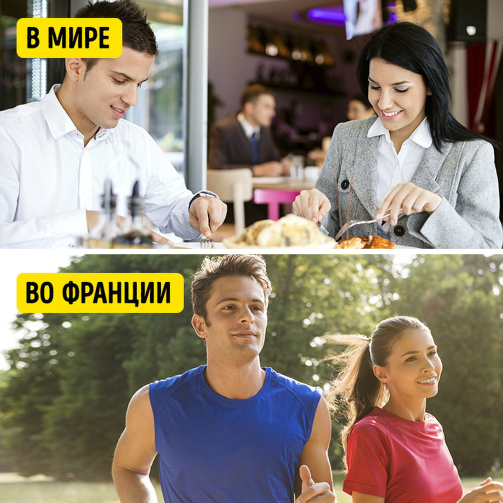 У багатьох французьких офісах, банках і держустановах обідня перерва триває не годину, а 2. Справа в тому, що до процесу прийняття їжі в цій країні ставляться серйозно — роботодавці дбають про те, щоб співробітники могли встигнути з'їздити додому і не поспішаючи пообідати. При цьому багато любителі ЗСЖ воліють використовувати таку довгу перерву для того, щоб побігати в найближчому парку або сквері.