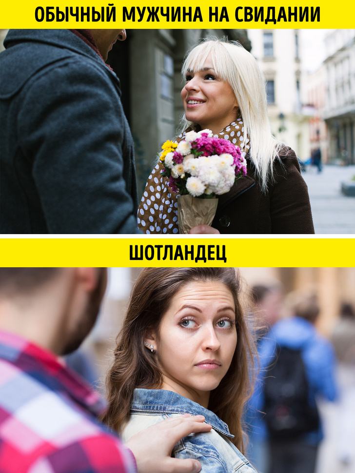 Дівчина по імені Поліна Росс розповіла у своєму відеоблозі про особливості життя в Шотландії. Наприклад, у шотландських чоловіків не прийнято дарувати квіти або навіть подарунки своїй коханій. У ресторані дівчина повинна бути готова до того, що її молодий чоловік чи наречений платити за неї не буде.