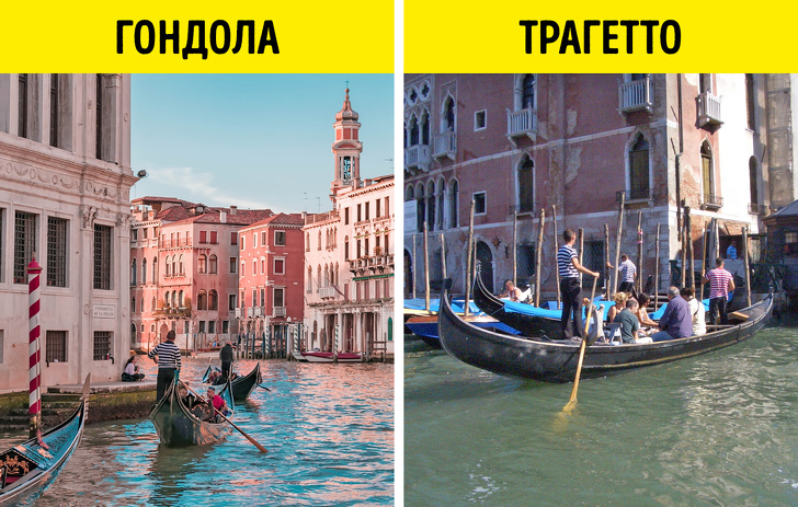 Всі подання і мрії про Венецію так чи інакше зводяться до романтичній прогулянці по каналах на гондолі. Задоволення це не з дешевих, але не покататися на ній — все одно що не побувати тут. Поїздка на гондолі обійдеться у € 80 за 30 хвилин (вартість фіксована по всьому місту). У човен поміщається до 6 чоловік, тому якщо знайти собі компанію, то можна заощадити.