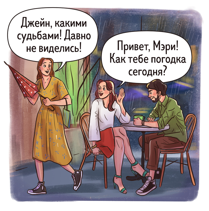 «Багато хто дослідники виходять з помилкових передумов, вважаючи, що, коли ми говоримо про погоду, ми і справді ділимося враженнями про неї. Розмова про погоду — це форма мовленнєвого етикету, покликана допомогти нам подолати природну стриманість і почати спілкуватися один з одним по-справжньому».