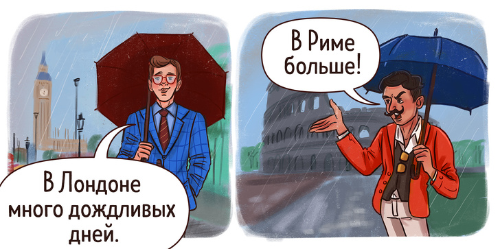Насправді в Лондоні не так сильно дощить, як, наприклад, в Римі, однак ніхто чомусь не включає столицю Італії в список сумних міст з вічними опадами (а турагентства, навпаки, називають Італію не інакше як сонячної).