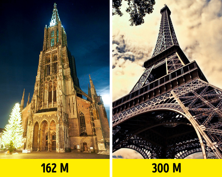 - Протягом чотирьох десятків років у світі не було будови більш високого, ніж Ейфелева башта. Спочатку вона височіла над землею трохи більше ніж на 300 метрів. До цього вважався найвищою будівлею Ульмський собор у Німеччині — його висота трохи більше 160 метрів.
