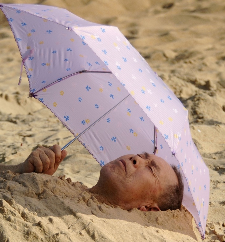 Китайці ховаються від сонця різними способами, і деяким фантазії не позичати. Якщо на пляжі ви побачите людину, закопаного за голову в пісок, не дивуйтеся, це звичайний літній ритуал місцевих жителів. А щоб не отримати сонячний удар або опік обличчя, вони використовують спеціальні маски або парасольки. До речі, останні тут застосовуються для захисту від ультрафіолетових променів навіть частіше, ніж від дощу.