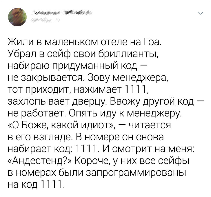 Користувач під ніком Mar.G0 написав у своєму пості, що злодійство на Гоа все-таки є. Але, як виявилося, їм промишляють не люди. «В готелі скрізь висіли таблички: „Коли спите або йдіть — замикайте вікно і двері на балкон“. Перша думка: невже тут ТАК крадуть? Пізніше дізналися у постояльців номери: на балконі залишалися горішки в пачці».