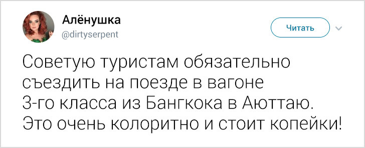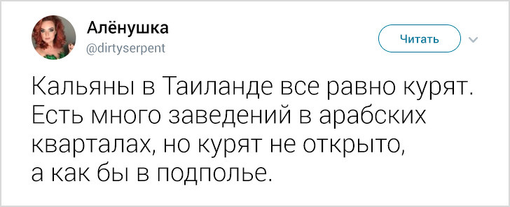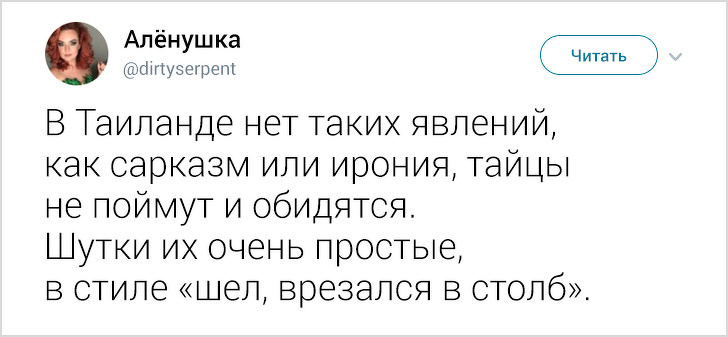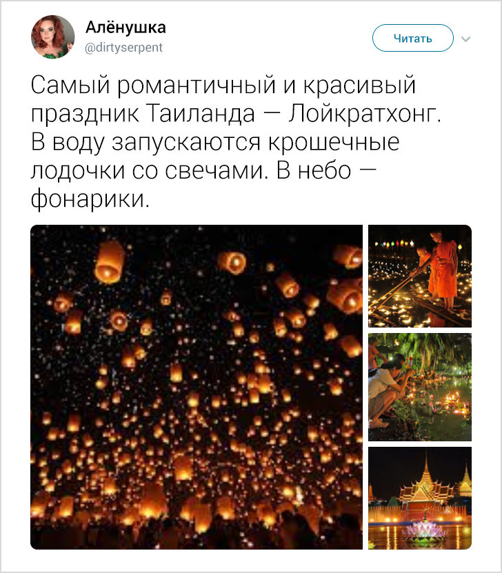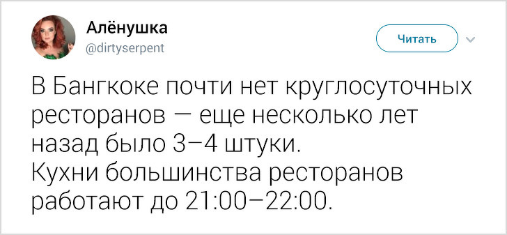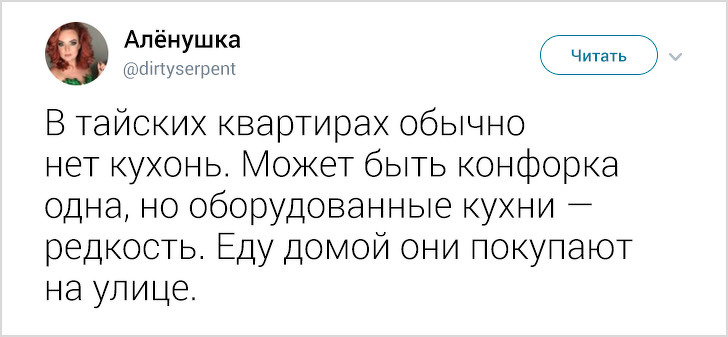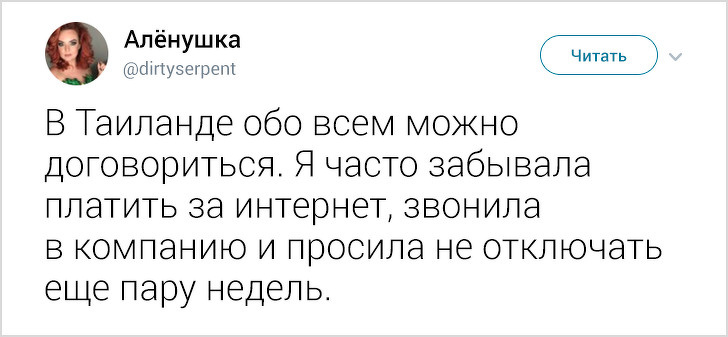Сонячний Таїланд — улюблене багатьма місце для зимового відпочинку. Але мало хто з нас прожив там досить довго, щоб дізнатися про самих цікавих особливостях країни. Оленка — москвичка, яка на 5 років покинула Росію і влаштувалася в Таїланді. Вона жила в Бангкоку, Паттайї, на Пхукеті і познайомилася з укладом життя корінних тайців, про що розповіла у своєму твіттері.