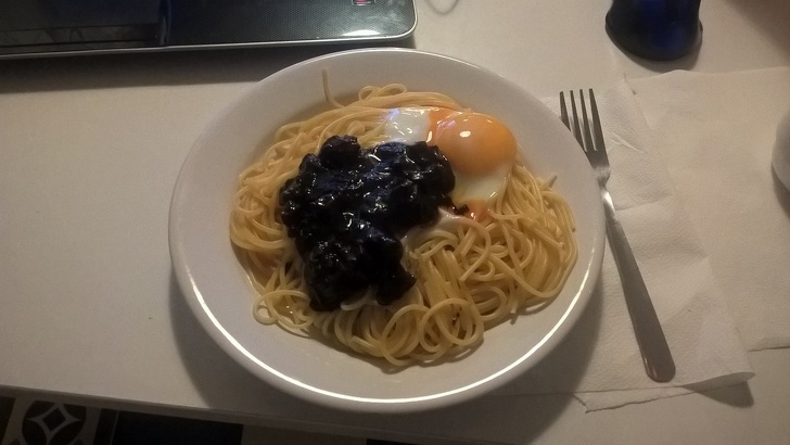 Так виглядав мій типовий обід. Чорна субстанція — це кальмар в незрозумілому соусі.