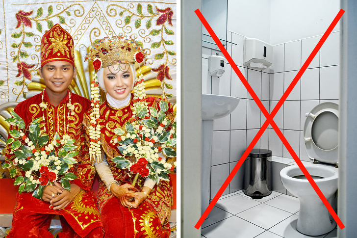 В громаді Тідонг (Індонезія) подружня пара не може відвідувати туалет протягом 3 днів після весілля. Вважається, що інакше шлюб не буде щасливим. За молодятами доглядають члени їх сімей, щоб ті не порушували традицію, і постачають їх невеликою кількістю їжі і води.