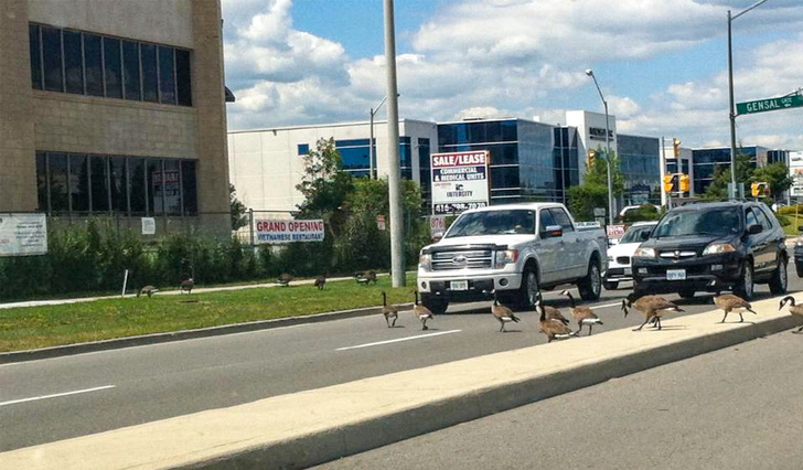- Милі фоточки гусей, які переходять дорогу, — цілком звичне явище. Звичайною є картина, коли качка зі своїм виводком неспішно переходить дорогу і всі 6 смуг машин терпляче чекають, поки закінчить рух останній каченя.