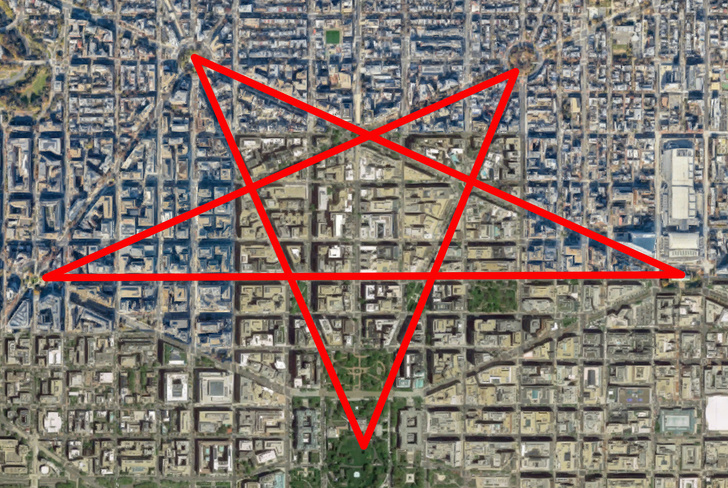 Вашингтон — столиця Сполучених Штатів Америки, на архітектуру якої зробило вплив масонство. На фото з повітря в забудові міста видно 5-кінцеві зірки (пентаграми), утворені перетинами вулиць.
