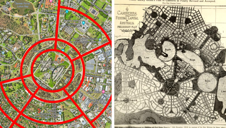 Столиця Австралійського Союзу, планування якій закладена концепція колеса і спиць. Міський план розроблений архітектором Уолтером Берлі Гріффіном. Центр і деякі важливі точки міста являють собою кільця, звідки головні проспекти розходяться, як спиці колеса.