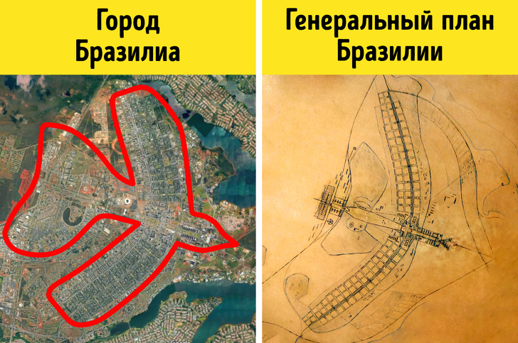 Однойменна столиця Бразилії, планування якої, її головних магістралей з прилеглими кварталами, дуже схожа на птаха з розпростертими крилами. Правда, згідно з генеральним планом архітектора Лусіо Кости, місто проектувався як гігантська метелик. Проект символізував звільнення країни від колоніального гніту і майбутній економічний розвиток.