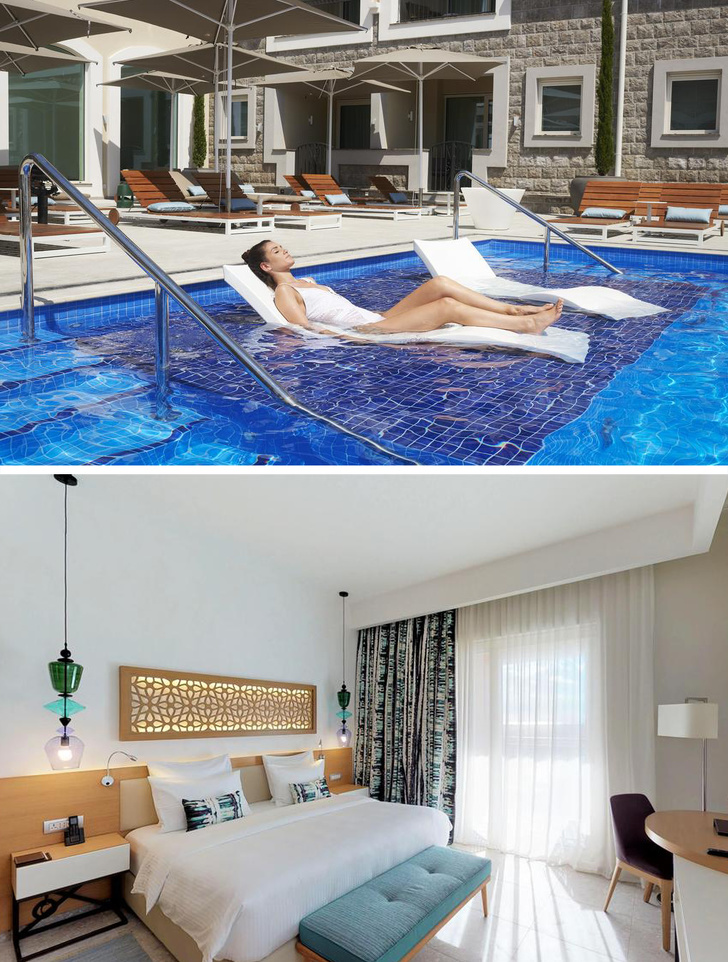 Лежаки в басейні. Чорногорія, готель The Chedi Luštica Bay (суперлюкс від € 267/добу)