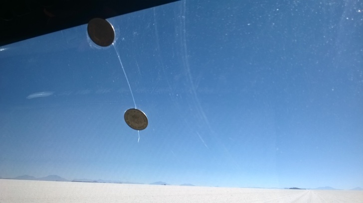 4. Якщо ви сідаєте в таксі і побачите ось такі монетки на лобовому склі, знайте: цей водій просто "полагодив" тріщину. У Болівії так багато роблять