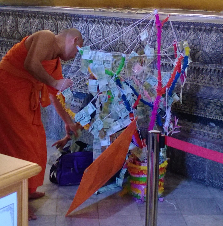 28. Тайські ченці дістають з величезної сумки купюри, щоб прикрасити ними «грошове дерево»
