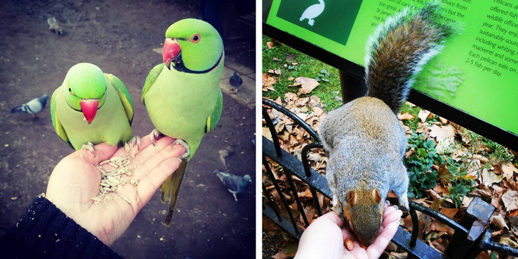 У парках Лондона, Суррея і Кента розплодилися зелені довгохвості папуги. Їх тут люблять і годують спеціальними сумішами для пернатих. А ще відмінно себе почувають білки. Ви тільки подивіться, яку угодовану красуню ми зустріли в Сент-Джеймсському парку Лондона. Місцеві жителі розгодували всіх тварин, які мешкають у них під боком: качки, гуси, лебеді, білки і навіть лисиці виглядають як пухнасті кульки.