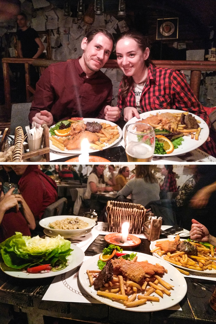 Ми замовили на двох одну порцію за 4 390 форинтів (1 000 рублів / € 14). Не найдешевший варіант, але в меню було заявлено, що в порцію входять картопля, салат і 3 види м'яса. Офіціант чемно запитав, чи не на двох ми замовляємо, і, отримавши ствердну відповідь, схвально кивнув. І нам принесли величезну кількість їжі. Все, що ви бачите знизу в наших руках (включаючи пів капусти з іншими овочами), — це одна порція, розділена на 2 тарілки.