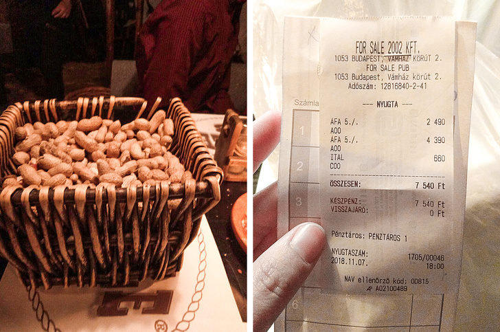 Ми замовили їжу на трьох. Це загальний чек на 7 540 форинтів, з яких 2 490 - за пасту, 660 - за келих пива, 4 390 - за наше з чоловіком блюдо. І так як я їла тільки половину останнього, то в кошторис я внесла 2 195 форинтів.