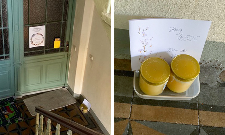 Ось так в моєму під'їзді дівчина продає домашній мед.