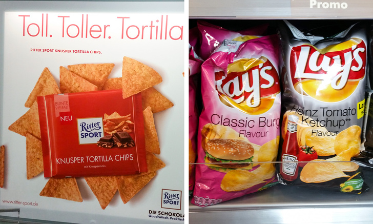 «Шоколад з хрусткими чіпсами». «Чіпси зі смаком класичного бургера і кетчупу Heinz».