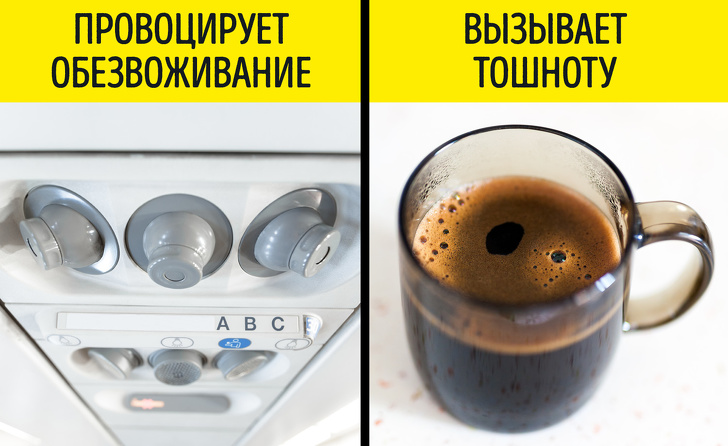Один з ворогів у літаку — це сухе повітря, який провокує зневоднення. Це може бути особливо небезпечно для людей із захворюваннями нирок. Варто зменшити його вплив: не надсилайте на себе кондиціонер, а краще не включайте його. Не варто також пити каву перед польотом або в літаку: він буде затримувати воду в організмі і може викликати нудоту.