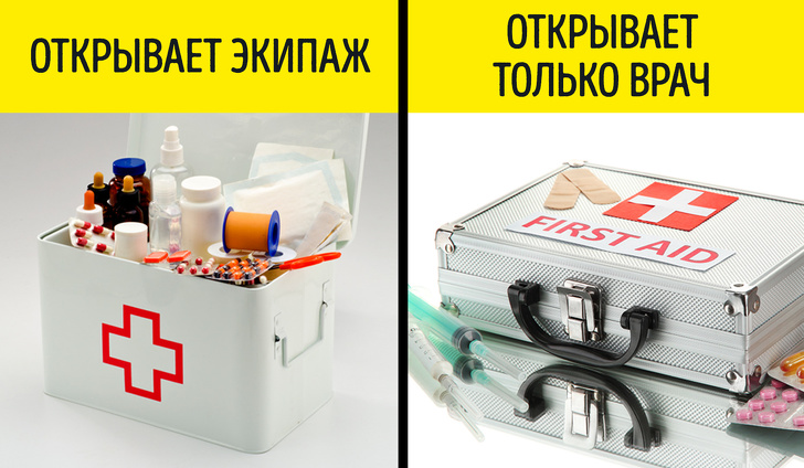 Зазвичай в літаку є аптечки двох видів. Першою скористаються, щоб надати невідкладну допомогу пасажирам, тут знаходяться знеболюючі, протиблювотні, сорбенти, препарати для зниження температури, нормалізації тиску, термометри, прилад для вимірювання тиску, кисневі маски, в деяких випадках — дефібрилятори.