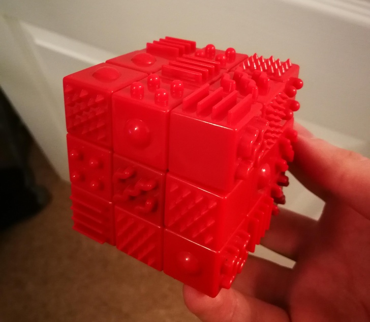 А це кубик Рубіка, який потрібно збирати не за кольорами, а за формою і розміром блоків