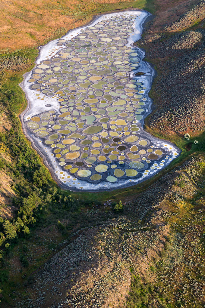 Плямисте озеро — мінеральне солоне озеро в Британській Колумбії, Канада, містить велику кількість різних мінералів. Влітку велика частина води в озері випаровується, оголюючи їх химерні кольорові поклади. Колір плям залежить від мінералу, більшість з них набуває свій відтінок завдяки сульфату магнію, який кристалізується в спеку. Мінерали тверднуть, утворюючи природні доріжки навколо плям.