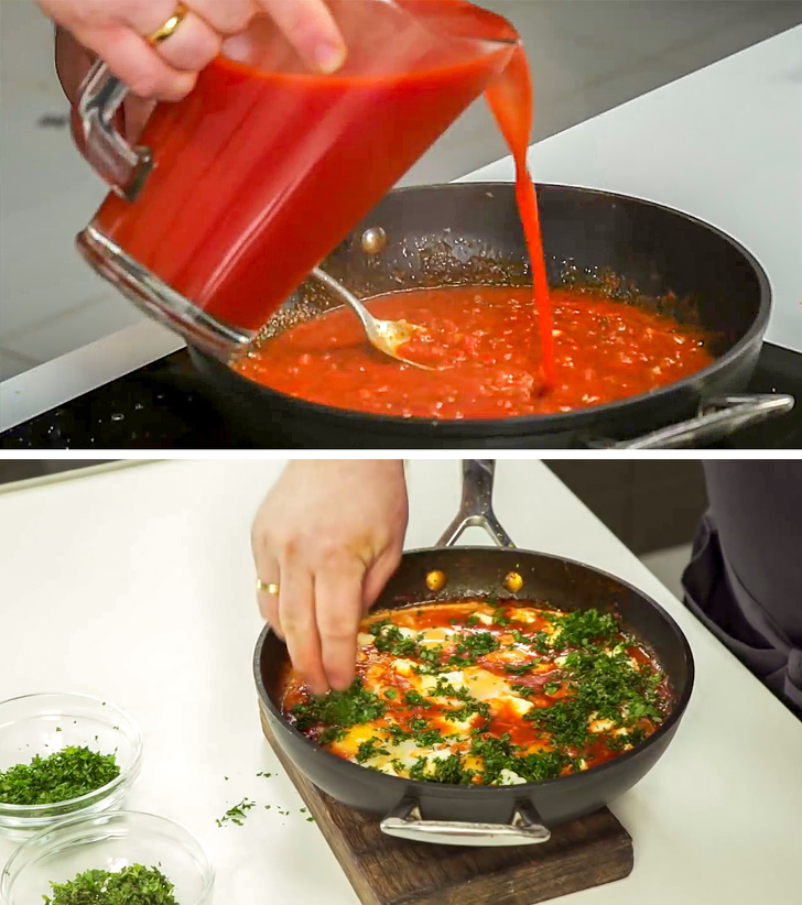 Приголомшливо смачний італійський варіант сніданку. Основа для цієї страви — соус маринара з томатів, цибулі, часнику і пряних трав. Якщо зробити заздалегідь, то на приготування сніданку по-італійськи піде буквально 10 хвилин. Треба буде лише розбити яйця на подушку з соусу, покрити натертим сиром і випікати до готовності. Є рекомендуємо зі свіжим хрустким хлібом.
