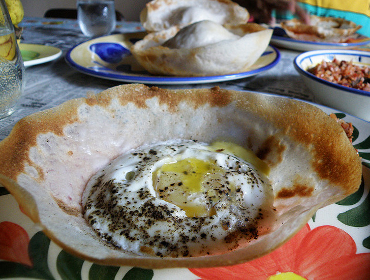 На Шрі-Ланці люблять готувати на сніданок ось таке красиве блюдо з яєць у традиційній коржику хоппер (аппа), яку їдять на острові замість хліба.