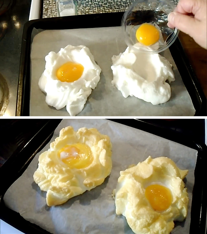 Треба лише відсадити збиті до міцних піків білки на деко, запекти в протягом пари хвилин, щоб вони тримали форму. А після цього покласти в кожне поглиблення по жовтку і випікати до готовності.