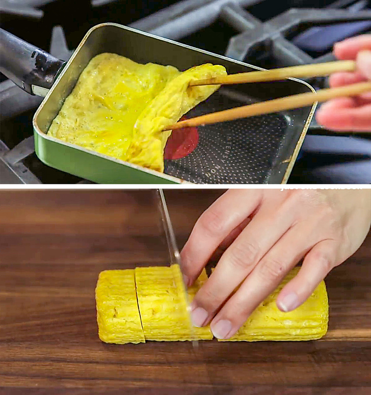 Традиційно цей омлет з яєць, соєвого соусу, цукру і мирина (рисового вина) смажиться в квадратній сковороді. Але звичайна млинниця і рисовий оцет теж підійдуть.