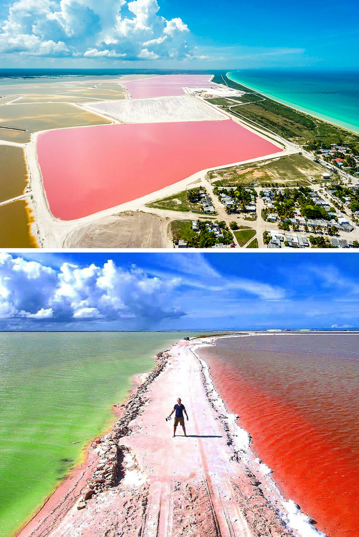 Панорама рибальського села Лас-Колорадас на Юкатані заворожує. Блакитні води затоки і лагуни Ріо-Лагартос в поєднанні з рожевим озером і контрастом на тлі жовто-зелених випарних ділянок з видобутку солі схожі на яскраве клаптева ковдра. Причина такого відтінку озера криється в мешкають тут артемиях і червоному планктоні, які виділяють особливі пігменти.