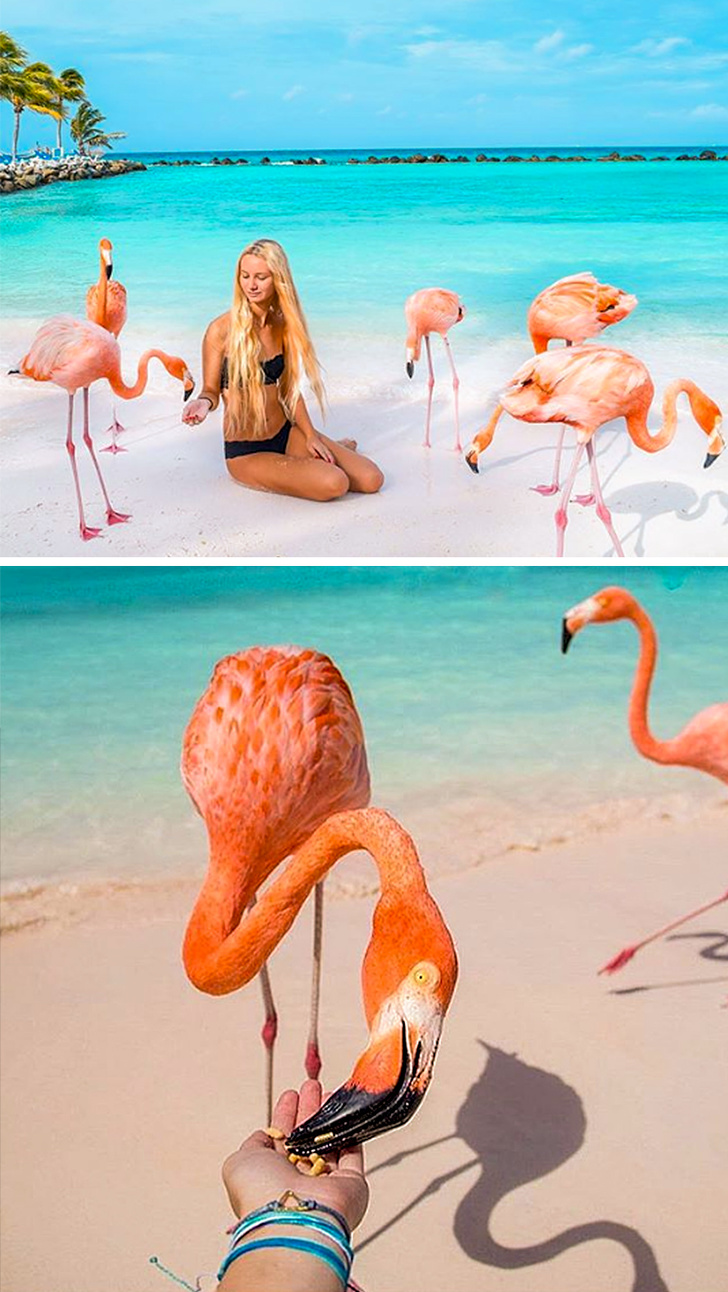 А ось і казка наяву - пляжі, де прекрасні фламінго будуть їсти з ваших рук. Вони живуть на Арубі, що входить до складу Королівства Нідерландів. Найбільше ручних птахів на приватному острові Ренейсанс, де знаходиться вишуканий готель.