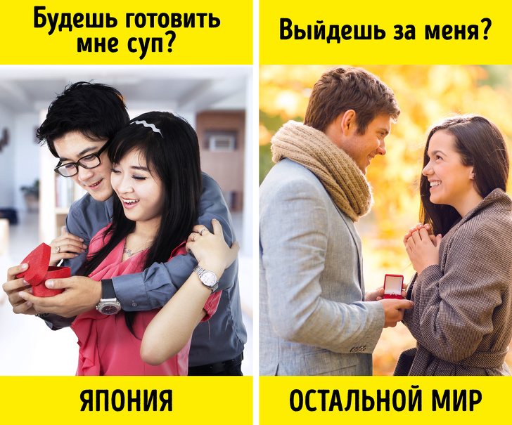 Японці дуже стримані і соромливі, тому традиційне пропозицію руки і серця нерідко роблять у непрямому вигляді. Наприклад, чоловік може запитати дівчину: «Ти будеш щодня варити для мене місо-суп?» Як варіант, можна з'ясувати у коханої, чи готова вона прати білизну або лягти разом в одну могилу (в останньому випадку чоловік з'ясовує, чи їх любов настільки сильною, що переживе їх обох).