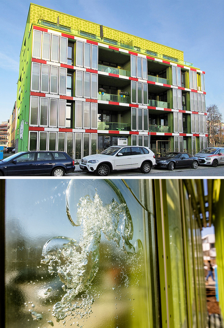 Футуристичний багатоквартирний «будинок з водоростей» в Гамбурзі — це перший в світі приклад биореакторного фасаду. Будинок отримує енергію, достатню для опалення та кондиціонування, виключно з мікроводоростей. На одному з фасадів цього зеленого будинку встановлені прозорі панелі, де живуть і розмножуються крихітні водорості з сусідньої річки Ельби. Також за допомогою «живих» панелей фасаду можна контролювати світло, що потрапляє в будинок.