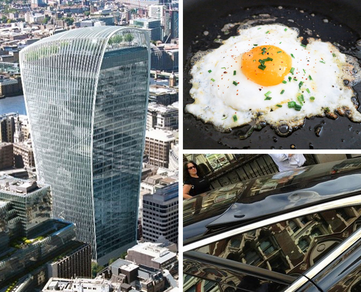 37-поверховий бізнес-центр Walkie Talkie став однією з істотних проблем Лондона. Відображаючи в своїх скляних стінах сонце, він, як гігантська лупа, почав плавити самі різні предмети на сусідній вулиці: машини, велосипеди, меблі в кафе навпроти. За цей хмарочос прозвали «подпаливателем». Однак багатьох місцевих жителів і туристів це забавляє: вони жартома смажать яєчню і розігрівають їжу на бордюрах будівлі.