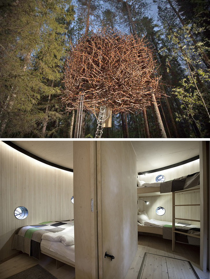 Treehotel — сучасна готель для тих, хто цінує тишу і єднання з природою. Готель являє собою 6 розташованих на деревах будиночків різноманітних форм і розмірів. Наприклад, будиночок «Гніздо птаха» оформлений у вигляді пташиного гнізда: його фасад побудований з гілок. Спальня і вітальня розділені розсувними дверима. Вхід в номер передбачений складаний сходах.