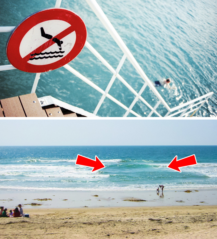 На море ж табличка із забороною купання часто рятує життя, адже їх ставлять навпроти ділянок з ріпами, що затягують людей у море. Ці течії бувають у різних куточках світу — Пхукеті, Азовському морі, Мексиканській затоці. Потрібно уникати запливів через вузькі протоки між косами та островами, а якщо ви вже потрапили в отбойную зону, то не пливіть до берега, а вздовж нього, щоб виплисти з відносить вас потоку і повернутися назад в іншому місці. І ніколи не ігноруйте заборона на пірнання, адже дно в таких місцях буває поцятковане непомітними камінням, залізними прутами і затонулими предметами.