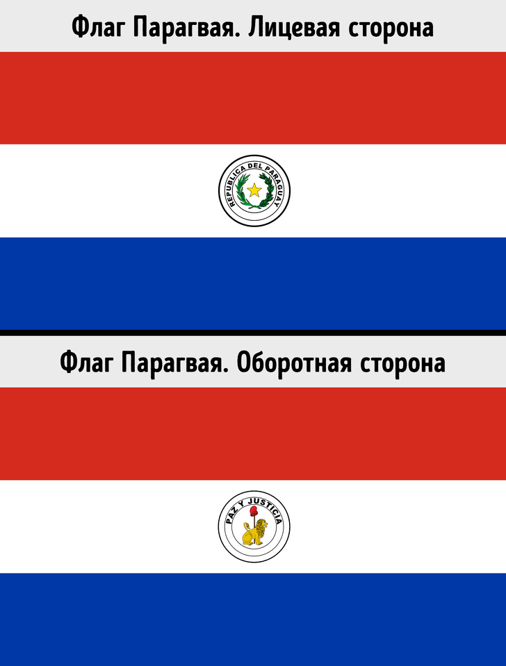 Прапор Парагваю унікальний тим, що у нього дві сторони — лицьовий та зворотний. На лицьовій зображено державний герб країни, а на зворотному — казначейська друк.