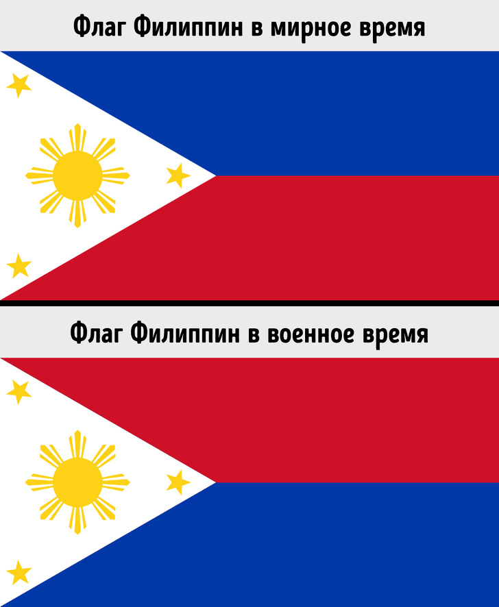 Філіппіни — єдина країна, колір прапора якої може змінюватися. У разі війни червона смужка стає синьою, а синя — червоною.
