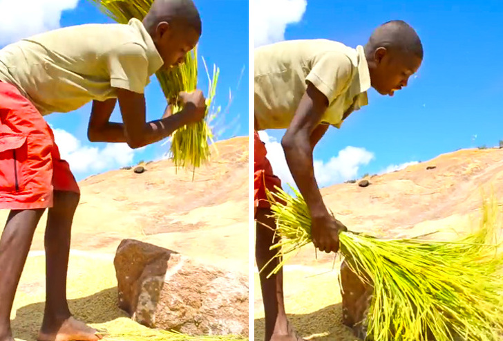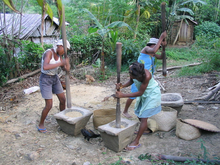 Малагасійці товчуть рис, очищаючи його від лушпиння.