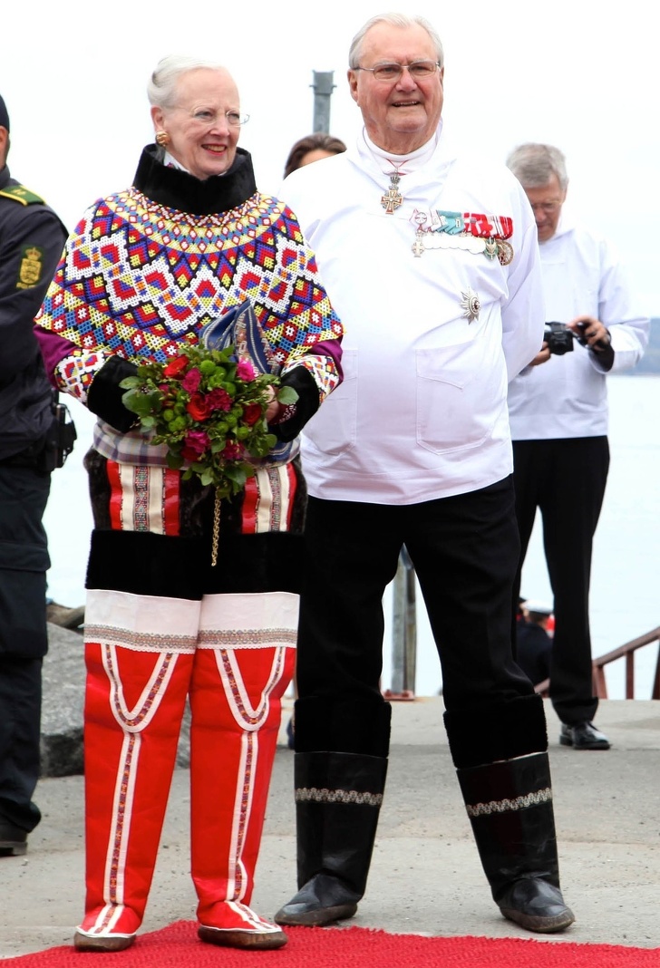 А на цьому фото зображена королева Данії Маргрете II зі своїм чоловіком, принцом Хенріком, під час офіційного візиту до Гренландії. На честь цієї події королівське подружжя вбралася в національний одяг гренландців, причому її жіночий варіант набагато яскравіше чоловічого. Візерунок на широкому комірі символізує північне сяйво, а колір чобіт-камиков означає, що королева заміжня, - незаміжнім жінкам покладаються білі камікі.